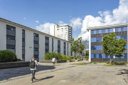 Le quartier de l’Arlequin situé à Grenoble doit son nom à ses façades colorées. Cette partie de la Villeneuve a été construite entre 1970 et 1972 à la place de l’ancien stade construit pour les Jeux olympiques d’hiver de 1968.