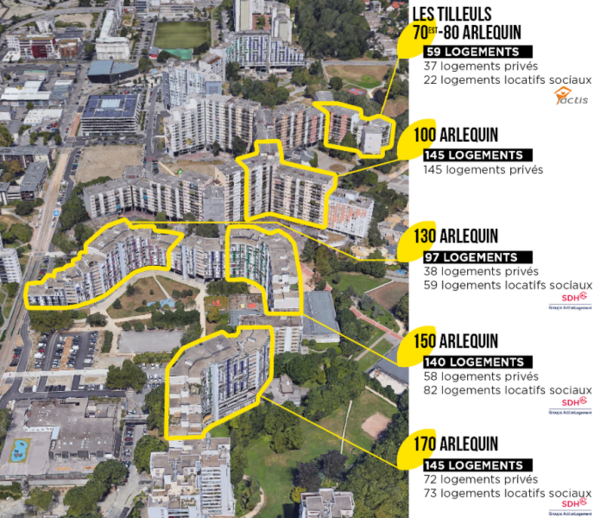 - La première phase du plan de sauvegarde s'est déroulée entre 2018 et 2020 et a permis de scinder 2 grandes copropriétés (60-120 Arlequin et 130-170 Arlequin) en résidences de plus petite taille tout en rendant indépendants les bâtiments de logements locatifs sociaux.