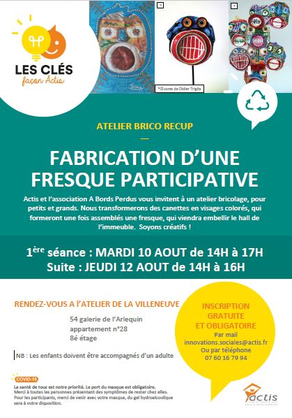 Deux prochains ateliers "Brico récup" sont d'ores et déjà organisés les 10 et 12 août après-midis avec l'association A Bords Perdus, mais ne sont pour le moment ouverts qu’aux locataires du 110 Arlequin (possibilité d'élargir à d'autres locataires si il n'y a pas assez d'inscrits). L’objectif est de réaliser une fresque participative avec des objets recyclés, qui sera accrochée dans l'entrée de l’immeuble, une fois que les travaux de retournement du hall prévus en août seront réalisés.