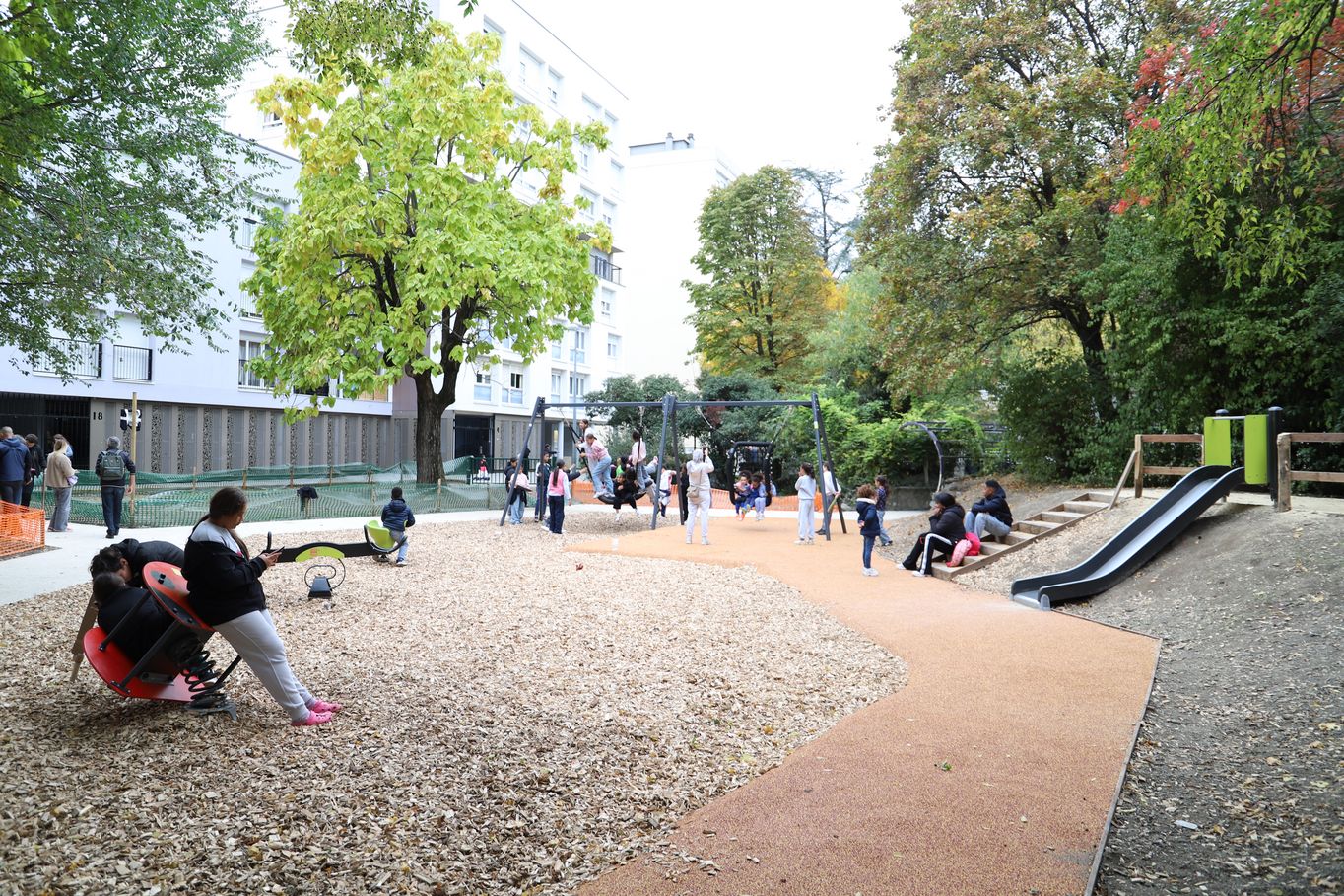 L’aire comprend des jeux à ressort, une toupie, des balançoires dont une accessible aux enfants à mobilité réduite, et un toboggan, pour les enfants de 0 à 12 ans. Le sol de l’aire a été recréé pour plus de sécurité, les cheminements et la végétalisation repensés, des bancs et une borne à eau installés.