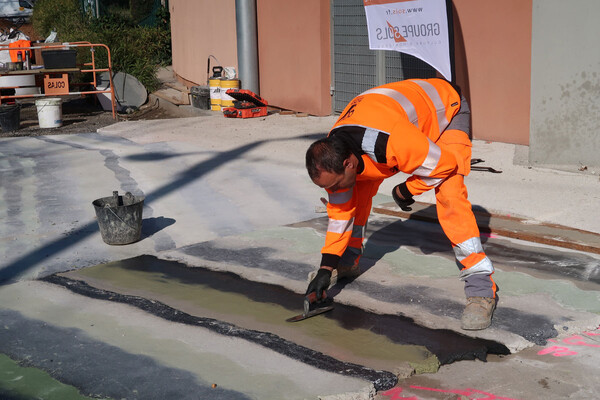 En 2024, encadrés par des étudiants de l’Institut d’urbanisme et de géographie alpine et de l’école d’architecture, les élèves de l’école du Verderet et du collège Olympique se sont relayés sur différents ateliers pour concasser des gravats, fabriquer du béton recyclé et couler leurs créations. Ces dernières ont ensuite servi de modèle pour réaliser cette œuvre d’art de 250 m² sur le parvis de la piscine des Dauphins.